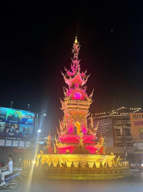 La torre dell’orologio di Chiang Rai, nel centro città, si illumina ogni sera con giochi di luce e musica. Andateci quando cala il sole. È una breve sosta, ma rende molto bene l’atmosfera serale della città.