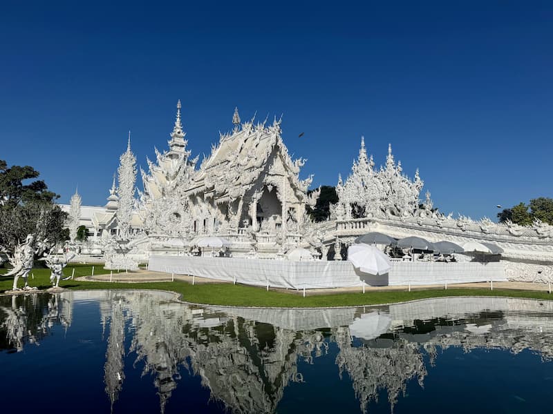 Il Tempio Bianco è il motivo per cui molti viaggiatori visitano Chiang Rai. Ed è uno di quei posti che dal vivo hanno un impatto quasi irreale. Totalmente bianco, con superfici che riflettono la luce del sole diventando quasi accecanti e sculture simboliche che rappresentano il ciclo della vita, il bene e il male.