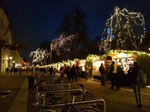 I mercatini di Natale di Lubiana si trovano lungo il fiume Ljubljanica.