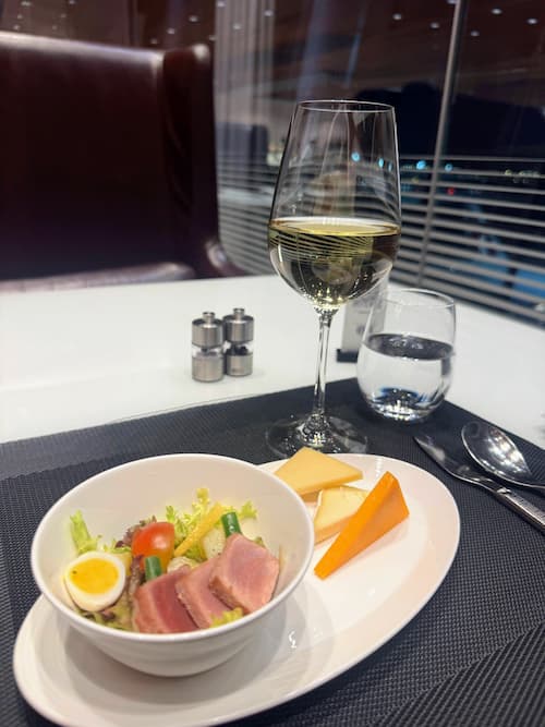 Quando sali sull’aereo trovi al tuo posto due menu a la carte, una per le bevande (alcoliche e analcoliche, con tanto di champagne) e uno per il cibo. Il bello è che puoi ordinare tutto quello che vuoi, quando vuoi e quante volte vuoi.