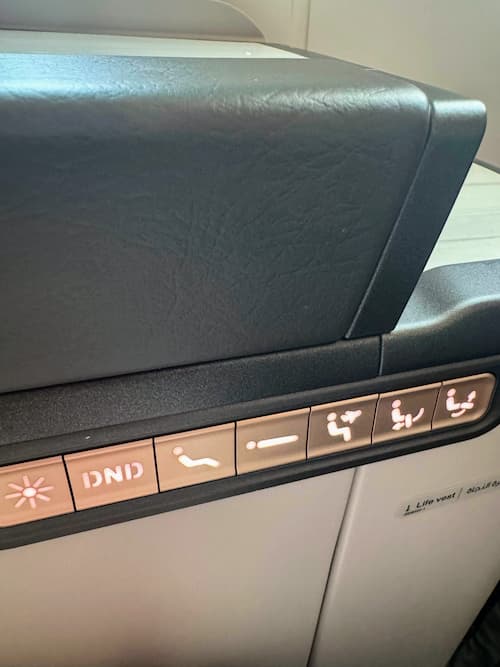 La postazione ha un sedile completamente reclinabile (quando è ora di dormire l’hostess ti mette anche un materassino), due cuscini, una coperta, due vani portaoggetti, schermo tv con telecomando, tavolo per mangiare, tavolo portaoggetti, vano con specchietto, cuffie insonorizzanti, bottiglia d’acqua e un kit con prodotti di bellezza Diptyque.