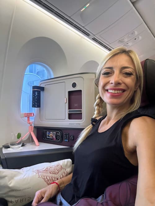 E così, uno dei miei pallini (che ho messo anche nella mia vision board e come sfondo del computer) era quello di viaggiare in business class con Qatar Airways, una tra le più eccellenti compagnie aree e quella con la business class migliore al mondo, secondo la World’s Top 100 Airlines 2025 di Skytrax. Dopo vari ripensamenti, una sera a cena parlandone con amici ho deciso di farlo. Nell’app di Qatar Airways ho cliccato “fai l’upgrade in business class” e dall’economy sono passata al magico mondo di chi viaggia in business. D’altronde lavoro, ho ormai 43 anni e sono una brava persona, quindi me lo sono meritata.
